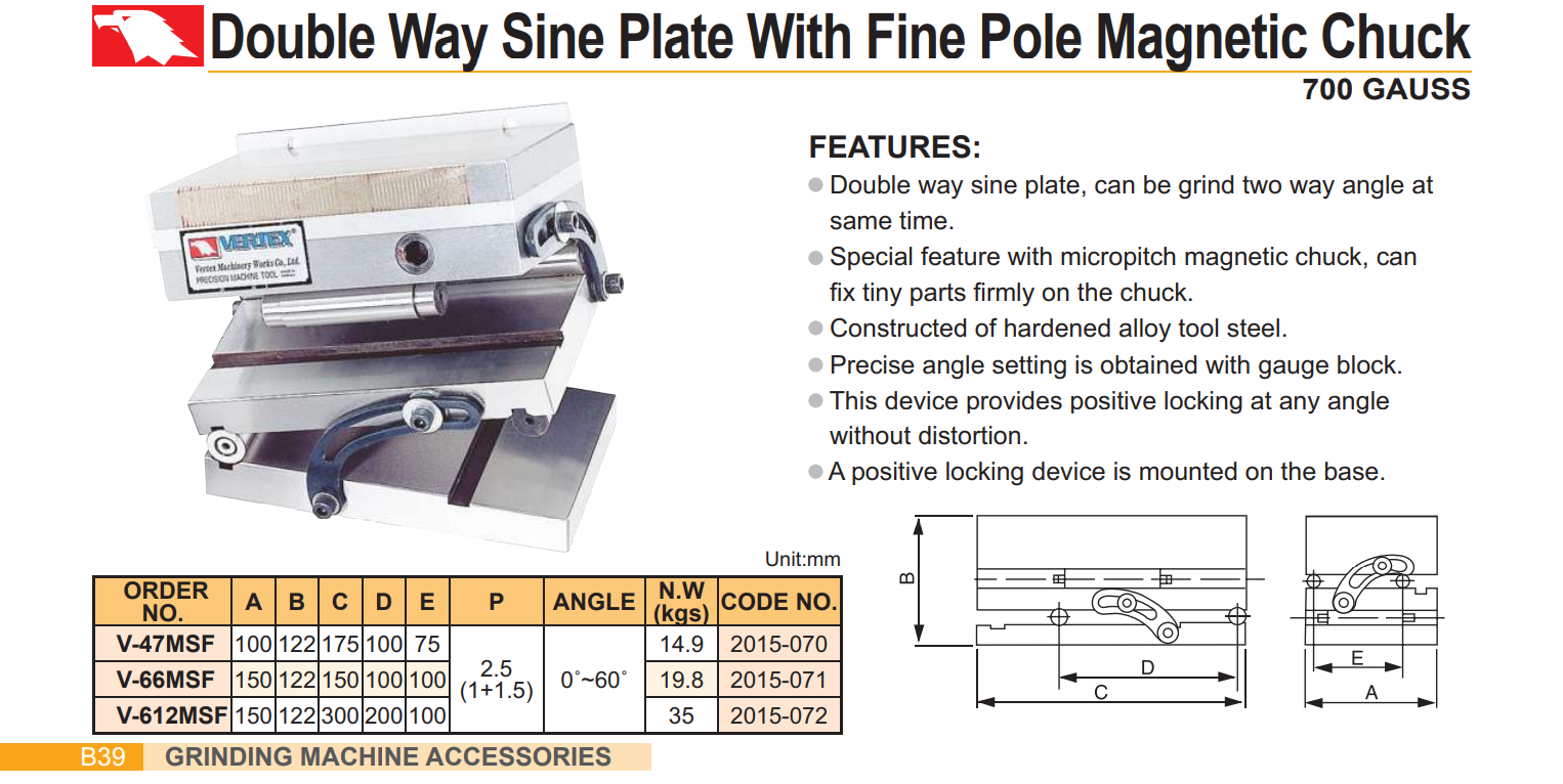 Bàn từ nghiêng hai chiều bước cực từ nhỏ mã V-47MSF, V-66MSF, V-612MSF hãng Vertex được sản xuất với chất lượng cao, chuyên dùng cho việc gá kẹp khi gia công sử dụng nguyên lý từ tính để kẹp chặt.