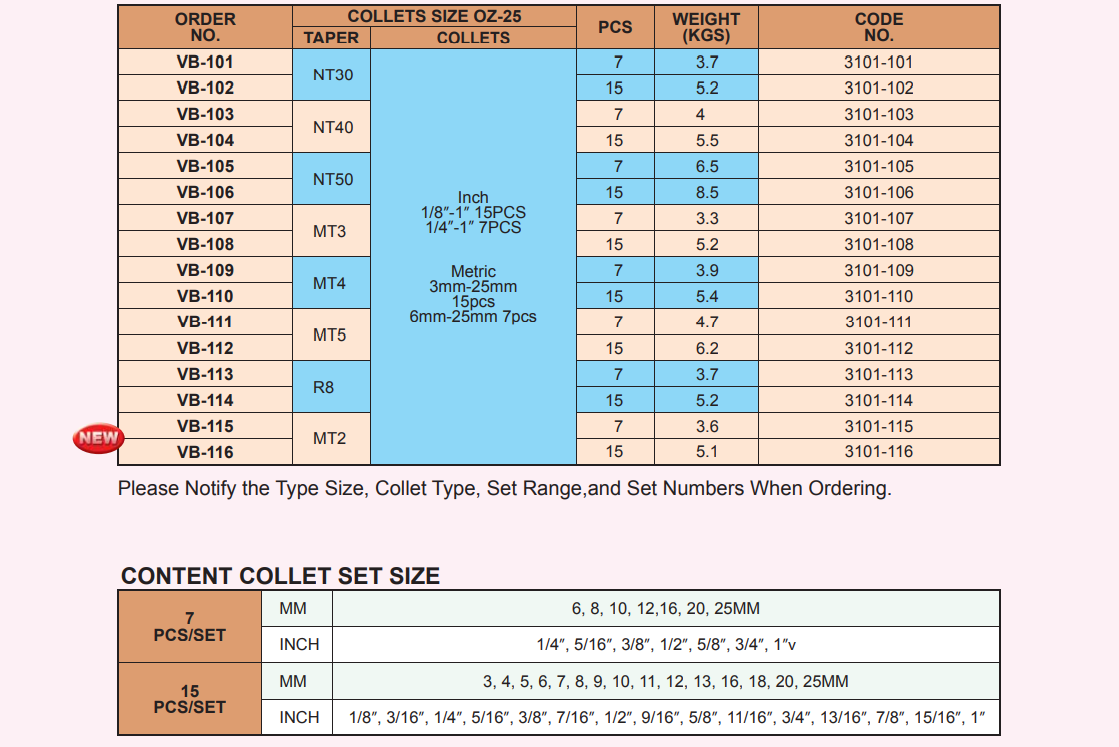 – 1 bộ bầu kẹp collet OZ25 bao gồm: 1 bầu kẹp, 1 chìa vặn, 1 hộp đựng và 7 hoặc 15 collet.