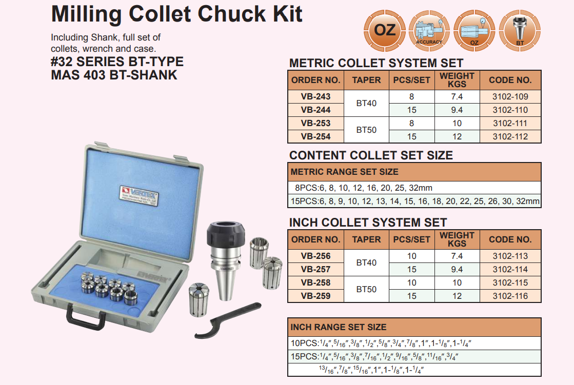 – 1 bộ bầu kẹp collet OZ25 bao gồm: 1 bầu kẹp, 1 chìa vặn, 1 hộp đựng và 7 hoặc 15 collet.