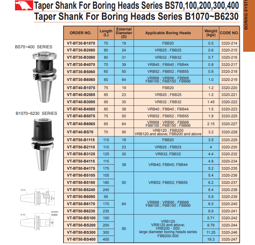 – Cột “Applicable Boring Heads” là kiểu lắp với các đài dao doa có kiểu lắp như vậy. Cần check đúng kiểu lắp này khi chọn các bầu kẹp và đài dao doa lắp với nhau.
