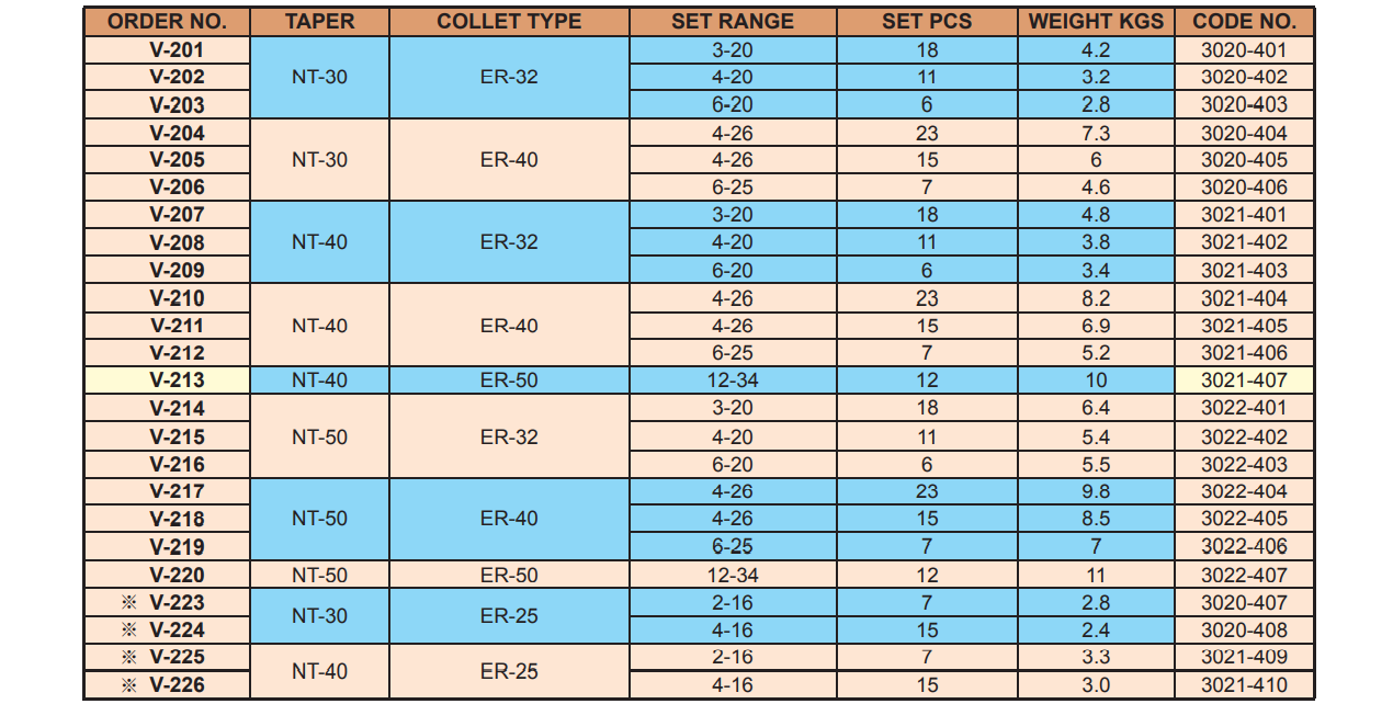 – Bảng bầu kẹp dao phay NT-ER riêng lẻ: V-101, V-102, V-103, V-104, V-105, V-106, V-107, V-108, V-109, V-110: