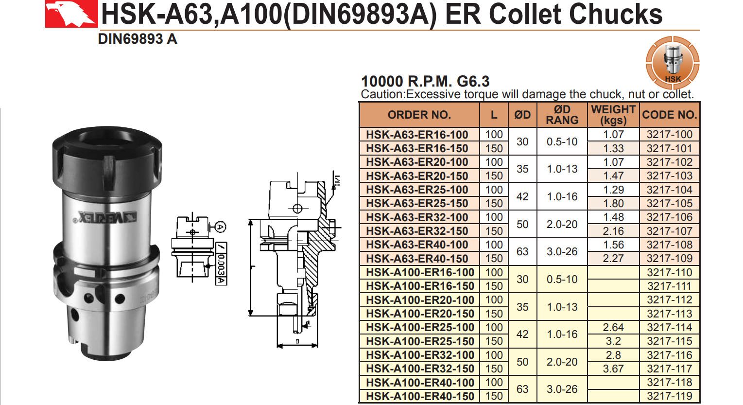 • Bầu kẹp dao phay ER HSK ( DIN ) các mã sản phẩm HSK-A63-ER16-100, HSK-A63-ER16-150, HSK-A63-ER20-100, HSK-A63-ER20-150, HSK-A63-ER25-100, HSK-A63-ER25-150, HSK-A63-ER32-100, HSK-A63-ER32-150, HSK-A63-ER32-100, HSK-A63-ER32-150, HSK-A63-ER40-100, HSK-A63-ER40-150, HSK-A100-ER16-100, HSK-A100-ER16-150, HSK-A100-ER20-100, HSK-A100-ER20-150, HSK-A100-ER32-100, HSK-A100-ER32-150, HSK-A100-ER40-100, HSK-A100-ER40-150 hãng Vertex sản xuất với chất lượng cao, sản phẩm có đầy đủ kiểu size cho bạn lựa chọn. Độ đồng tâm rất cao 0.008/ inch hay 0,02/25mm.