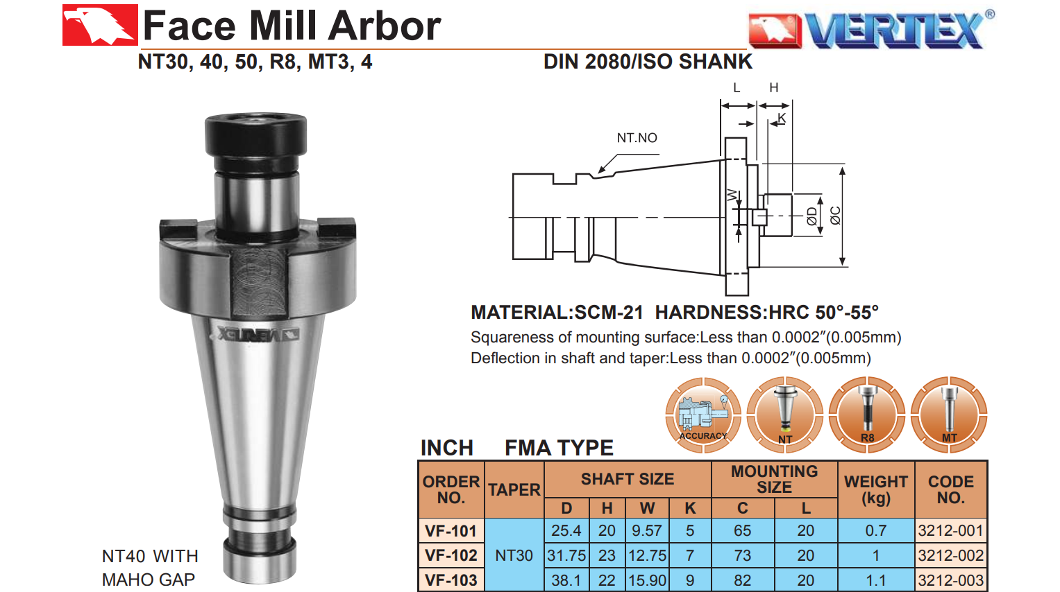 Bầu kẹp dao phay khỏa mặt NT30, NT40, NT50, R8, MT3, MT4 hệ Inch: VF-101, VF-102, VF-103, VF-104, VF-105, VF-106, VF-109, VF-110, VF-111, VF-112, VF-114, VF-115, VF-116, VF-117