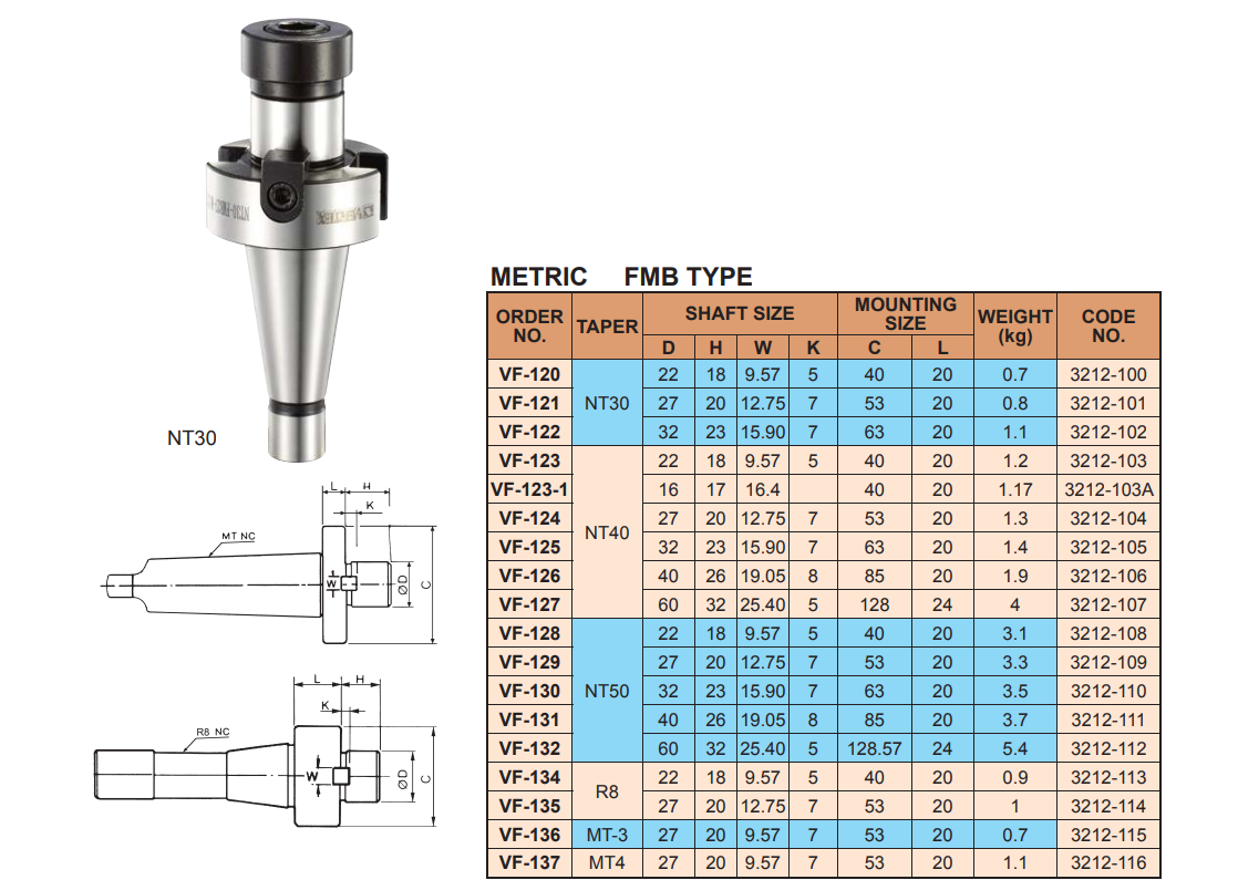 Bầu kẹp dao phay khỏa mặt NT30, NT40, NT50, R8, MT3, MT4 hệ Mét: VF-120, VF-121, VF-122, VF-123, VF-123-1, VF-124, VF-125, VF-126, VF-127, VF-128, VF-129, VF-130, VF-131, VF-132, VF-134, VF-135, VF-136, VF-137