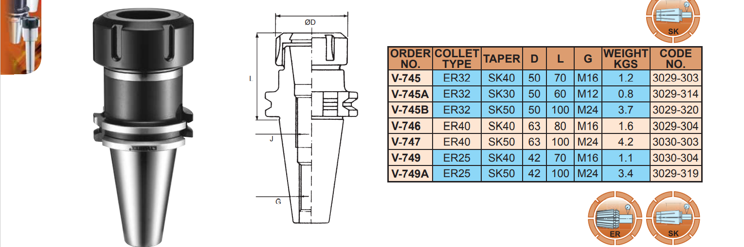 – Collet ER16, ER20, ER25, ER32, ER40 theo tiêu chuẩn DIN 6499 (xem sản phẩm Collet ER).