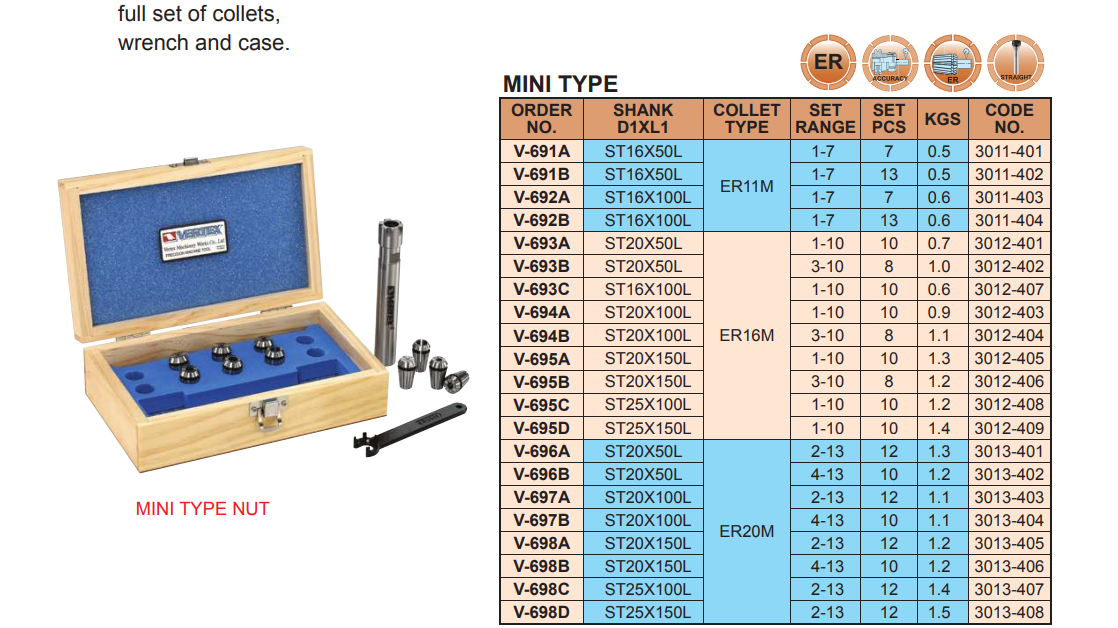 – Collet ER08, ER11, ER16, ER20 theo tiêu chuẩn DIN 6499 (xem sản phẩm Collet ER).