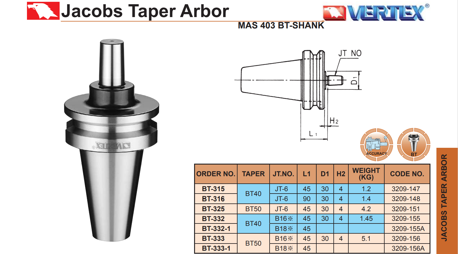 – Kiểu côn bầu kẹp nối BT30, BT40, BT50 VERTEX sản xuất theo tiêu chuẩn MAS 403.