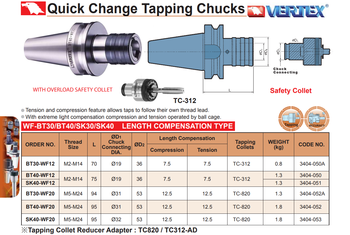 – Bầu kẹp ta rô kiểu collet thay nhanh VERTEX sử dụng kẹp ta rô từ M2 – M36 và 1/8” – 1-3/8”.