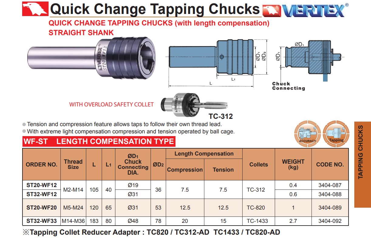 – Bầu kẹp ta rô kiểu collet thay nhanh VERTEX sử dụng kẹp ta rô từ M2 – M36 và 1/8” – 1-3/8”.