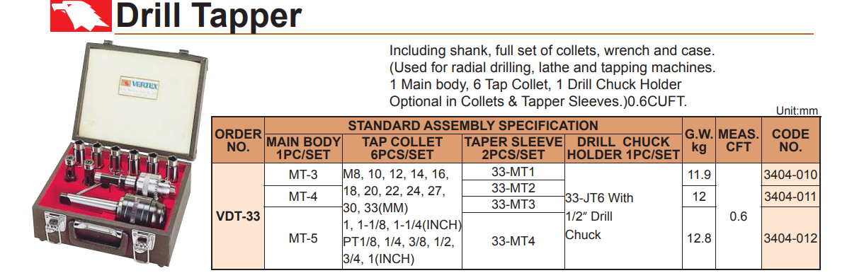 – Bộ bầu kẹp ta rô, mũi khoan VDT-33-MT3, VDT-33-MT4, VDT-33-MT5 của VERTEX sử dụng kẹp ta rô từ M8 – M33, 1/8” – 1” và kẹp mũi khoan từ 0.5 – 13mm.