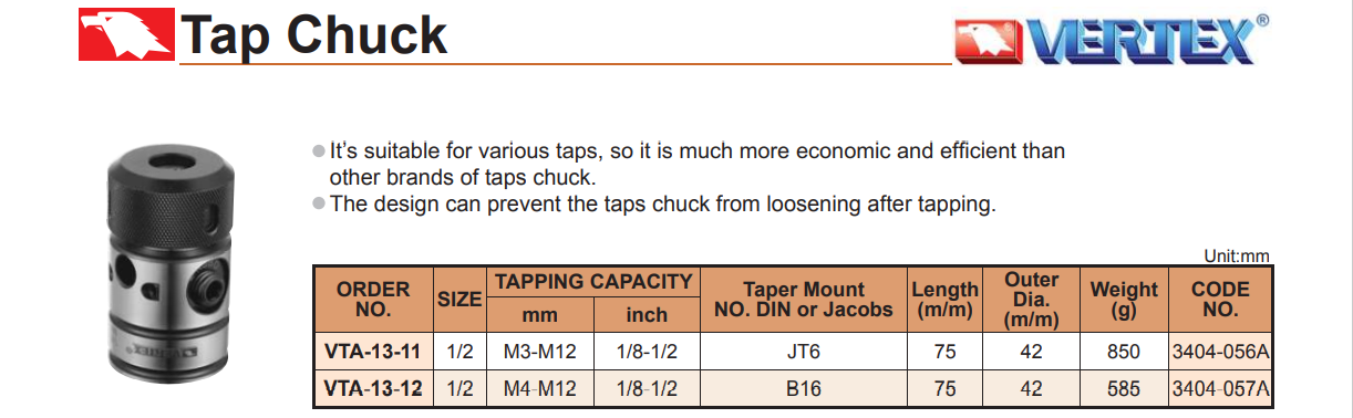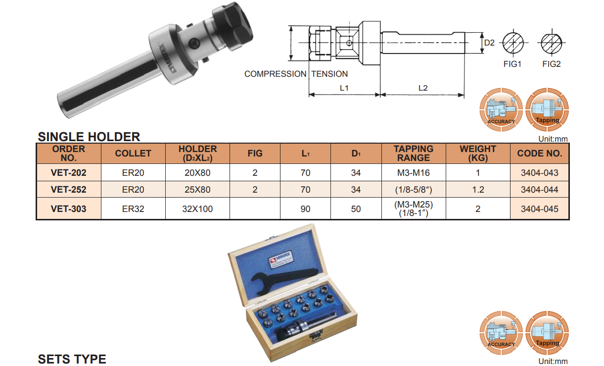 – Bầu kẹp ta rô VET của VERTEX kẹp ta rô bằng các collet ER20 và ER32.