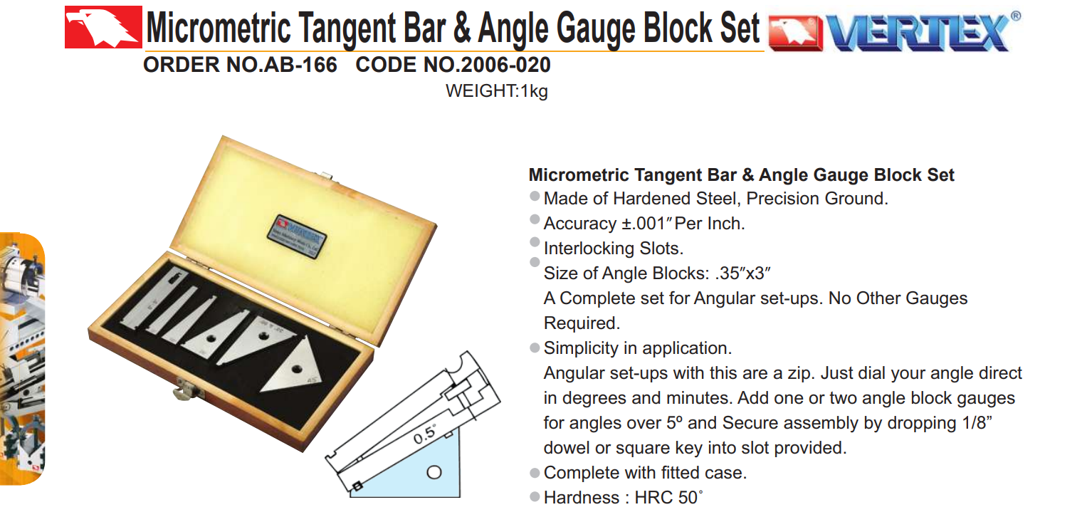 – Bộ căn góc chính xác AB-130, AB-163, AB-164, AB-166, AB-167, AB-113 của VERTEX được sử dụng để kê định vị tạo góc nghiêng cho chi tiết khi phay, khoan, mài,…