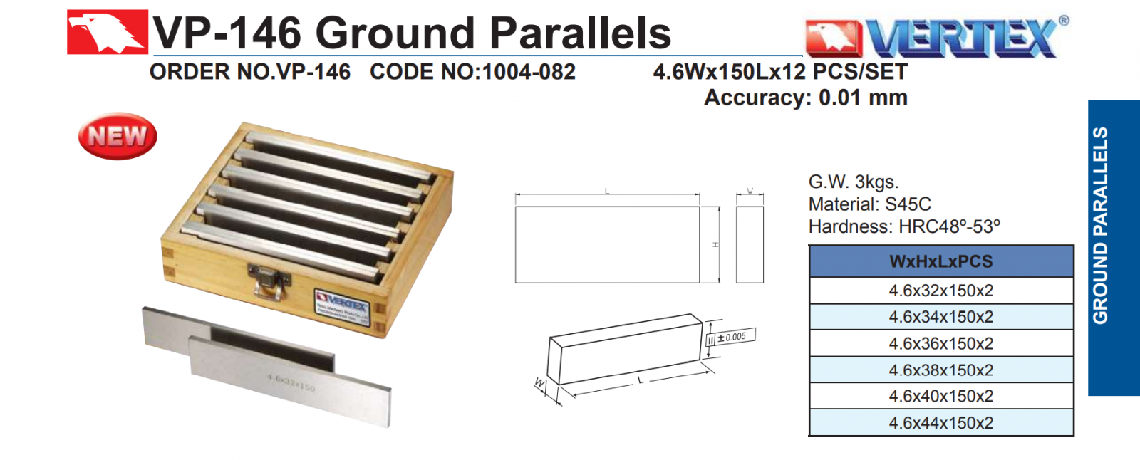 • Bộ căn song song mã VP-146 được hãng Vertex sản xuất, sản phẩm chuyên dùng cho việc căn chỉnh, kê gá trong quá trình gá đặt trên bàn máy khi gia công nhằm đạt độ chính xác cao.