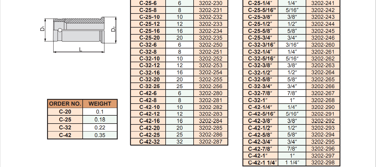 Bảng bộ collet trụ C-32, C-42, C-20, C-25 (bao gồm cả bộ, đơn lẻ, hệ Mét, Inch): C-20-6P, C-25-7P, C-32-7P, C-42-8P, C-20-6I, C-25-7I, C-32-7I, C-42-8I; C-20-4~C-20-16; C-25-4~C-25-20; C-32-6~C-32-25; C-42-6~C-42-32;…