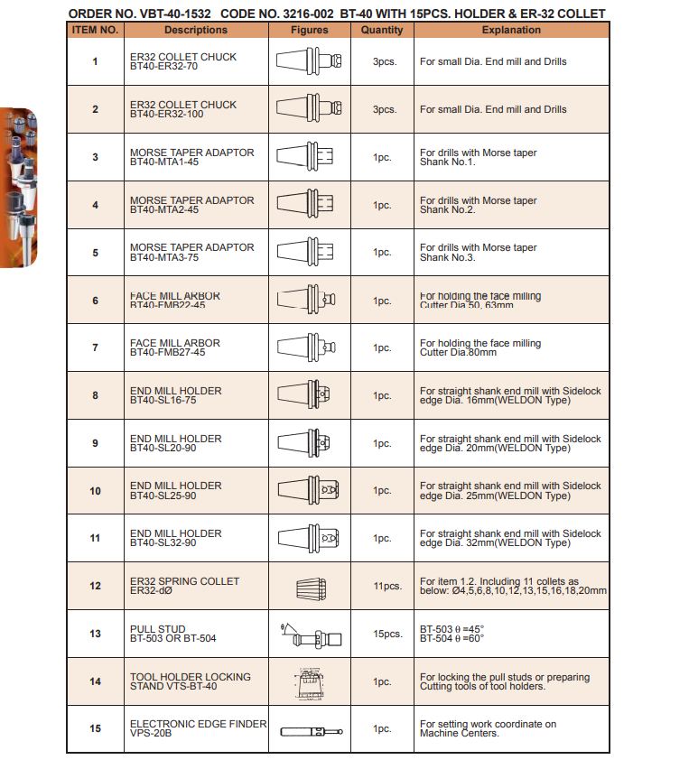 – Bộ gá kẹp dao đầy đủ cho máy phay NC VBT-30-0720, VBT-30-1520, VBT-40-1532, VBT-40-2432 của VERTEX dùng gá kẹp dao trên máy phay NC kiểu côn BT30, BT40.