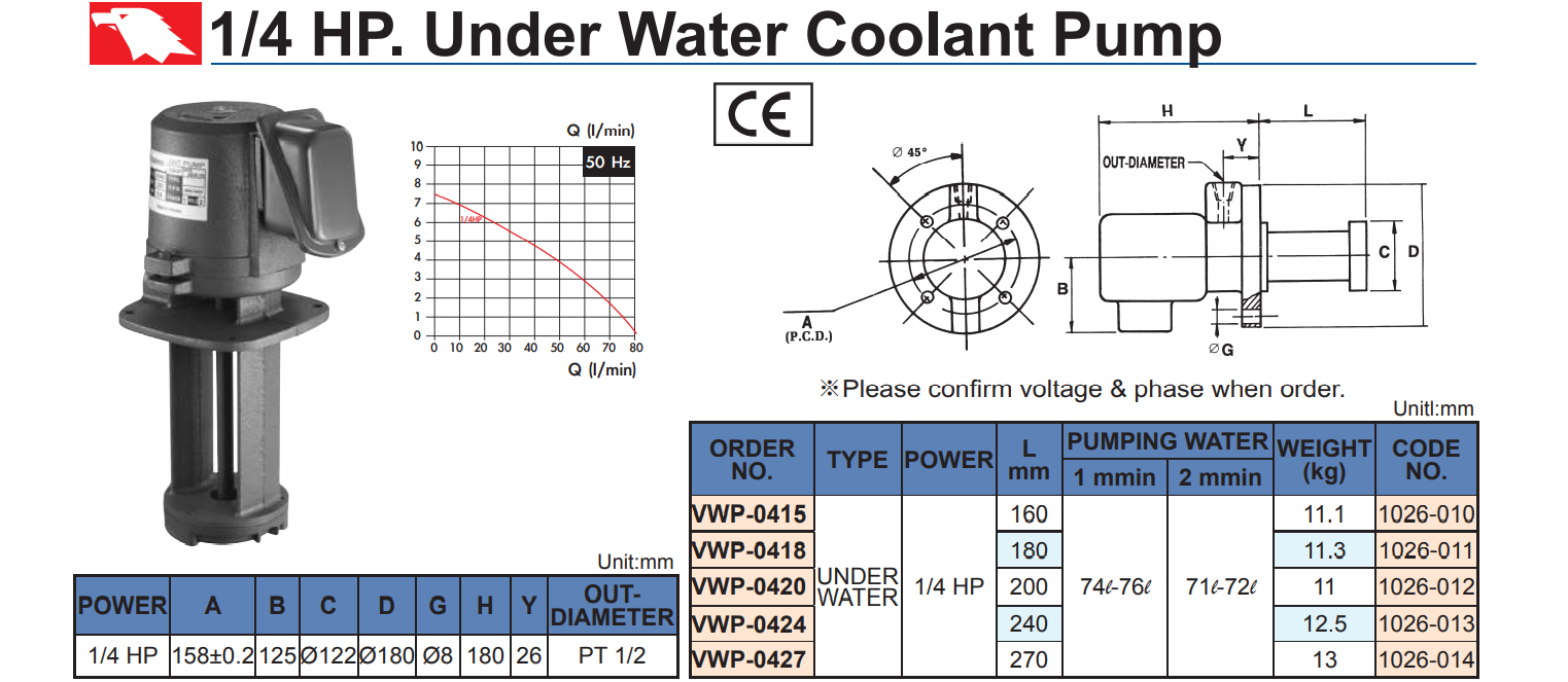 – Bơm dung dịch tưới nguội 1/4HP: VWP-0415; VWP-0418; VWP-0420; VWP-0424; VWP-0427: