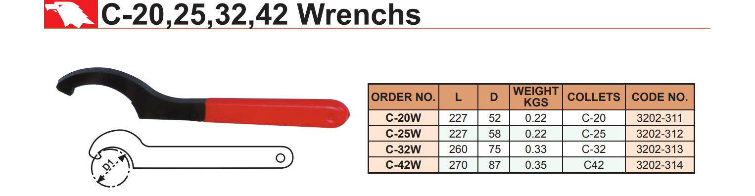 Bảng bộ collet trụ C-32, C-42, C-20, C-25 (bao gồm cả bộ, đơn lẻ, hệ Mét, Inch): C-20-6P, C-25-7P, C-32-7P, C-42-8P, C-20-6I, C-25-7I, C-32-7I, C-42-8I; C-20-4~C-20-16; C-25-4~C-25-20; C-32-6~C-32-25; C-42-6~C-42-32;…