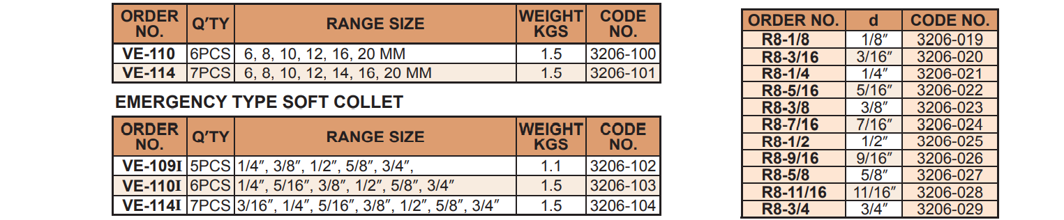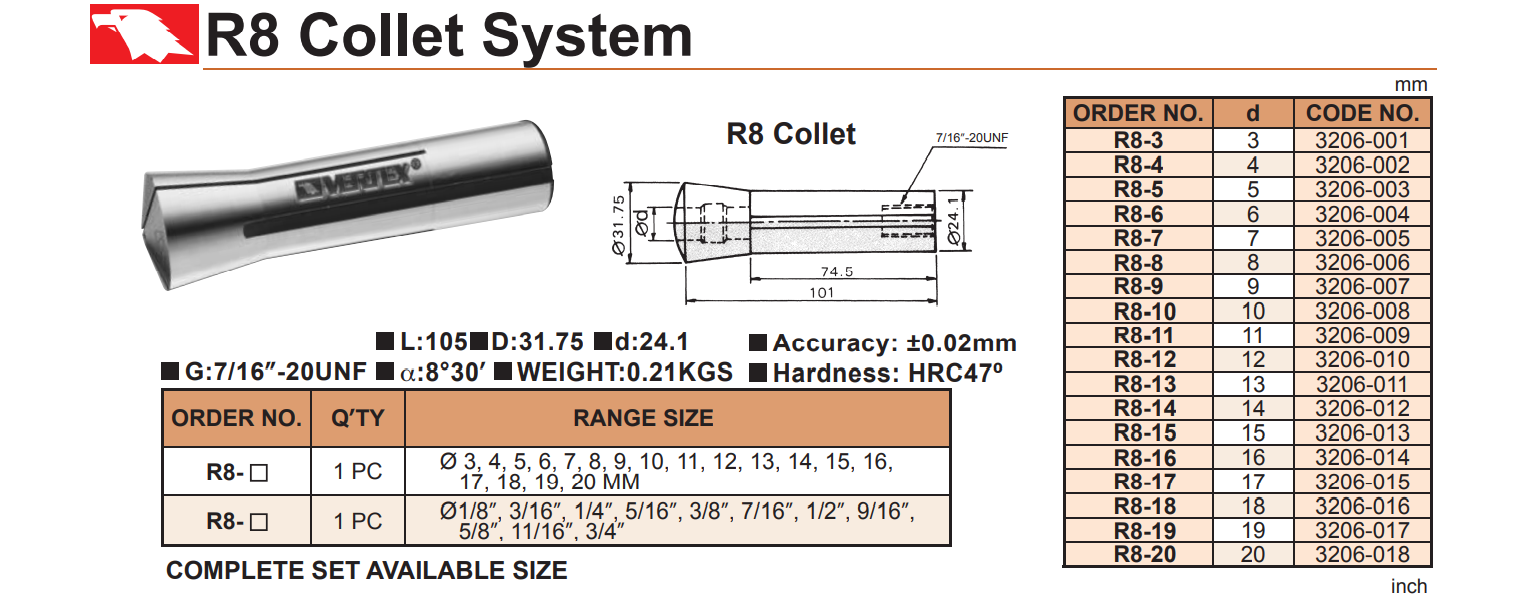 • Collet 5C và R8  mã 5C-3, 5C-4, 5C-5, 5C-6, 5C-7, 5C-8, 5C-9, 5C-10, 5C-11, 5C-12, 5C-13, 5C-14, 5C-15, 5C-16, 5C-17, 5C-18, 5C-19, 5C-20, 5C-21, 5C-22, 5C-23, 5C-24, 5C-25, 5C-1/8, 5C-3/16, 5C-1/4, 5C-5/16, 5C-3/8, 5C-7/16, 5C-1/2, 5C-9/16, 5C-5/8, 5C-11/16, 5C-3/4, 5C-13/16, 5C-7/8, 5C-15/16, 5C-1, R8-3, R8-4, R8-5, R8-6, R8-7, R8-8, R8-9, R8-10, R8-11, R8-12, R8-13, R8-14, R8-15, R8-16, R8-17, R8-18, R8-19, R8-20, R8-1/8, R8-3/16, R8-1/4, R8-5/16, R8-3/8, R8-7/16, R8-1/2, R8-9/16, R8-5/8, R8-11/16, R8-3/4