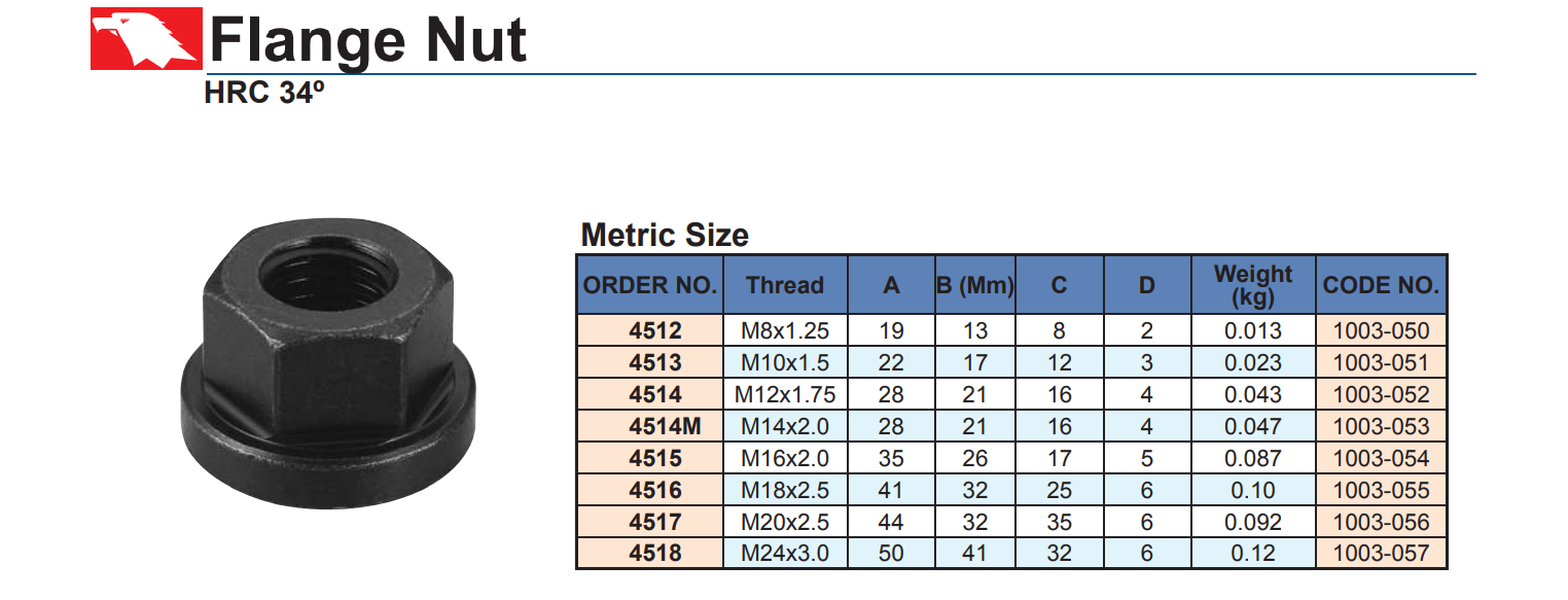 Đai ốc mặt bích 4512, 4513, 4514, 4514M, 4515, 4516, 4517, 4518, 4512I, 4513I, 4514I, 4515I, 4516I, 4517I, 4518I hãng Vertex, chuyên dùng trong việc kẹp chặt chi tiết trên bàn máy khi gia công. Hàng được phân phối và giao hàng tận nơi trên toàn quốc.