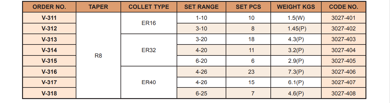 – Có thể đặt hàng theo bầu kẹp đơn lẻ (không có chìa vặn) hoặc cả bộ (bao gồm: bầu kẹp, bộ collet, chìa vặn (ER16 không có chìa vặn) và hộp; xem các model cả bộ ở bảng dưới