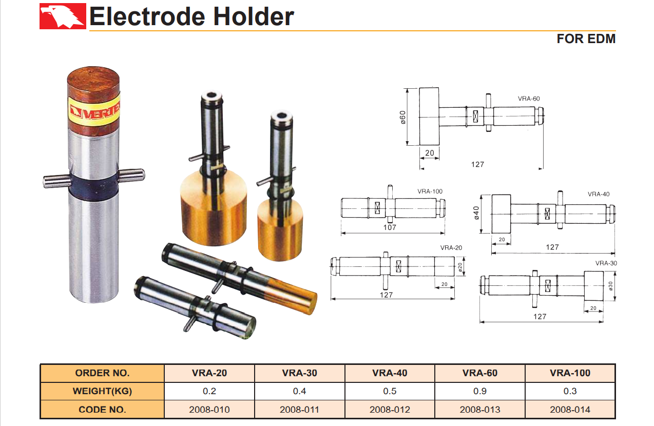 Đầu kẹp điện cực Vertex VRA-20 với vật liệu là thép không gỉ, dùng để gá kẹp các điện cực đồng trong quá trình xung.