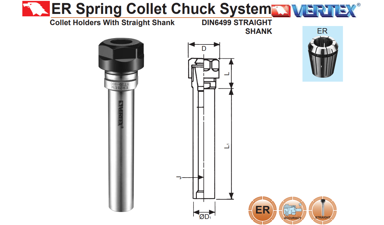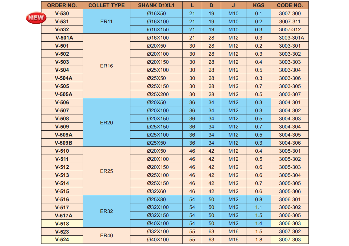 Đầu kẹp kiểu trụ thẳng collet ER mã V-530, V-531, V-532, V-501, V-502, V-503, V-504, V-504A, V-505, V-505A, V-506, V-507, V-508, V-509, V-509A, V-509B, V-510, V-511, V-512, V-513, V-514, V-515, V-516, V-517, V-517A, V-518, V-523, V-524