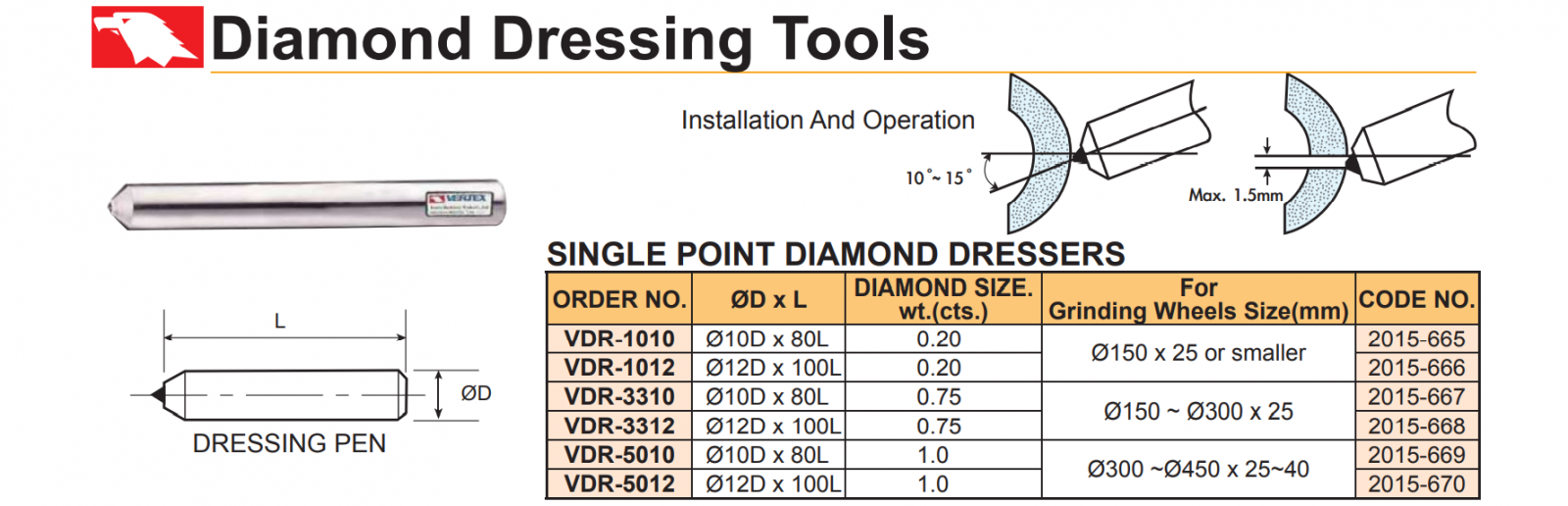 – Đầu kim cương sửa đá mài VDR-1010, VDR-1012, VDR-3310, VDR-3312, VDR-5010, VDR-5012 của VERTEX dùng sửa biên dạng đá mài của máy mài phẳng.