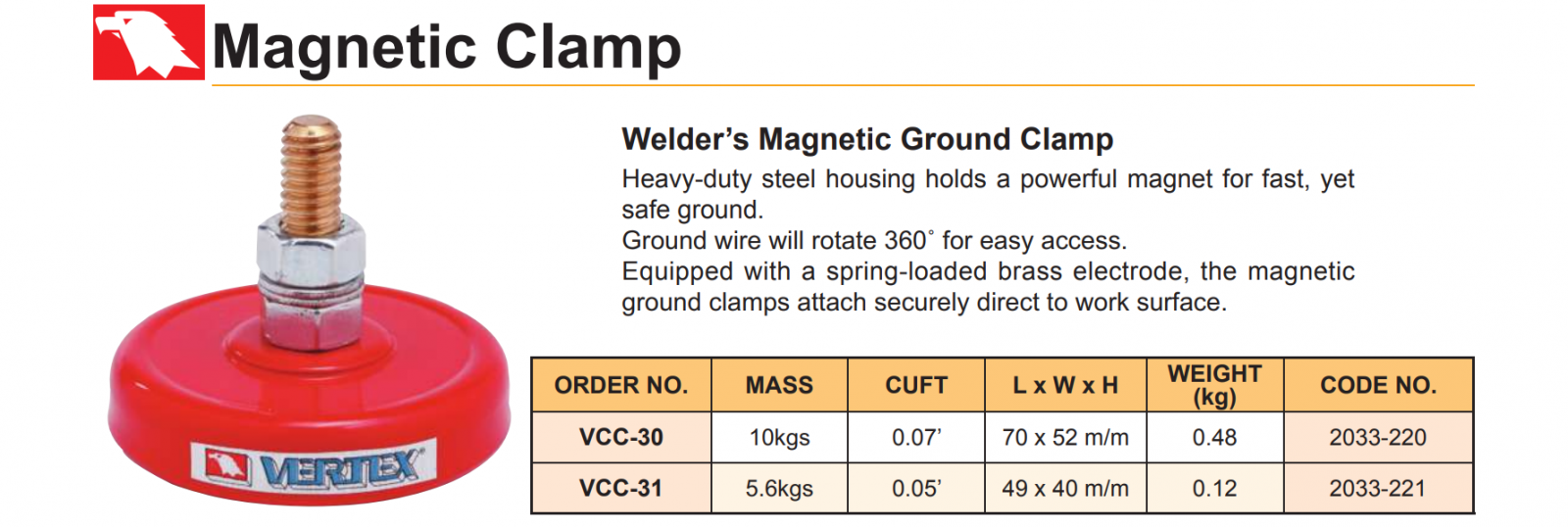 – Đế kẹp từ nam châm VCC-30, VCC-31, VCC-33, VCC-34 của VERTEX dùng kẹp cố định các chi tiết với nhau bằng lực hút từ trước khi hàn, lắp ghép.