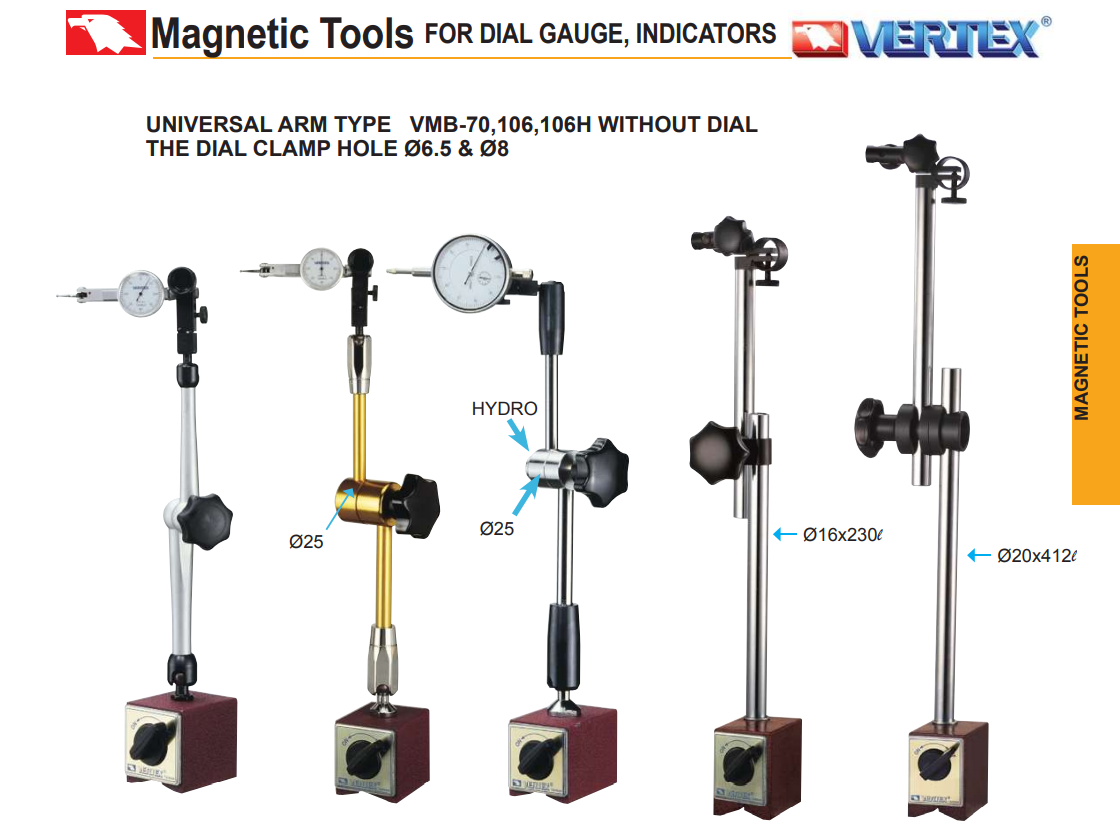 – Đế từ gá đồng hồ so VMB-B, VMB-01, VMB-02, VMB-03, VMB-181, VMB-185, VMB-70, VMB-106, VMB-106H, VMB-160, VMB-180, VMB-182H, VMF-112, VMF-102A, VH-70 của VERTEX sử dụng gá kẹp đồng hồ so để kiểm tra độ đồng tâm của dụng cụ, thiết bị gá kẹp và trục máy.