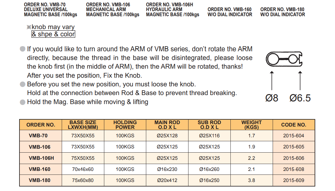 – Đế từ gá đồng hồ so VMB của VERTEX có 2 lỗ F8 và F6.5 để gá kẹp đồng hồ so.