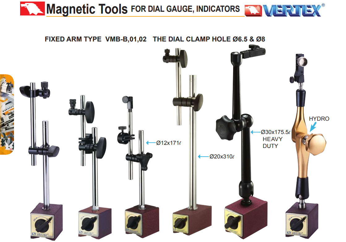 – Đế từ gá đồng hồ so VMB-B, VMB-01, VMB-02, VMB-03, VMB-181, VMB-185, VMB-70, VMB-106, VMB-106H, VMB-160, VMB-180, VMB-182H, VMF-112, VMF-102A, VH-70 của VERTEX sử dụng gá kẹp đồng hồ so để kiểm tra độ đồng tâm của dụng cụ, thiết bị gá kẹp và trục máy.