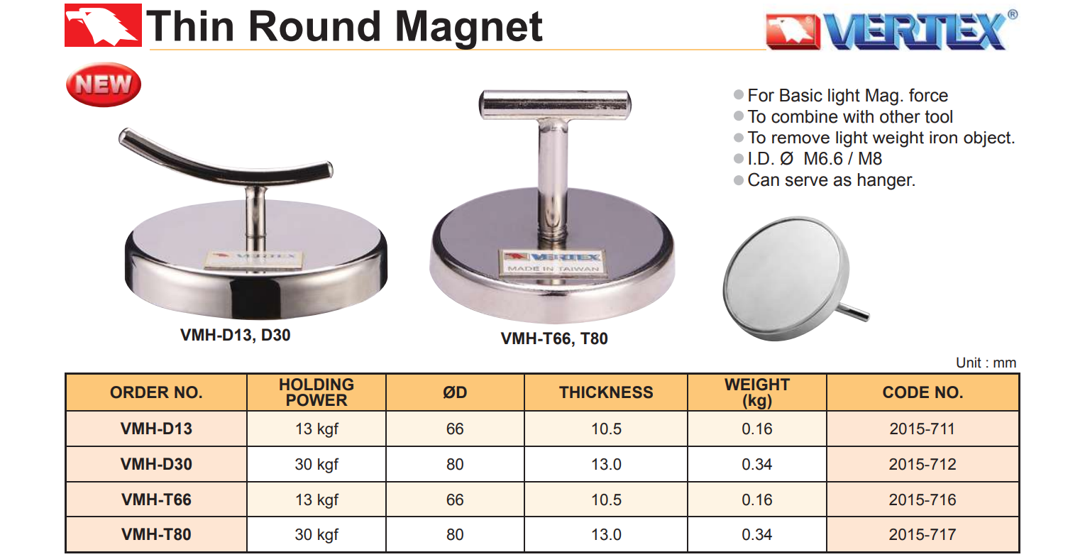 – Đế từ tròn mỏng VMH-D13, VMH-D30, VMH-T66 của VERTEX sử dụng để treo dụng cụ, phụ kiện khác lên tường kim loại bằng lực hút từ.