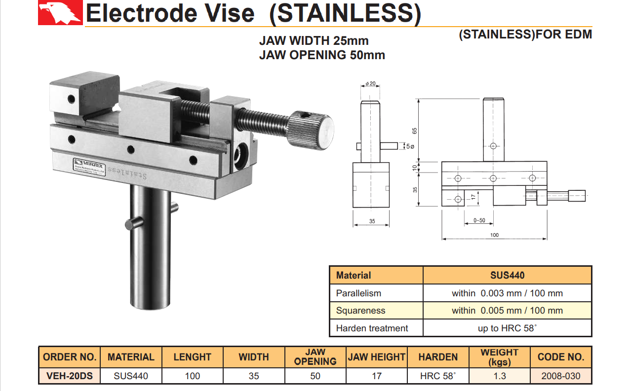 Ê tô kẹp điện cực Vertex VEH-20DS với vật liệu là thép không gỉ, dùng để gá kẹp các điện cực đồng trong quá trình xung.