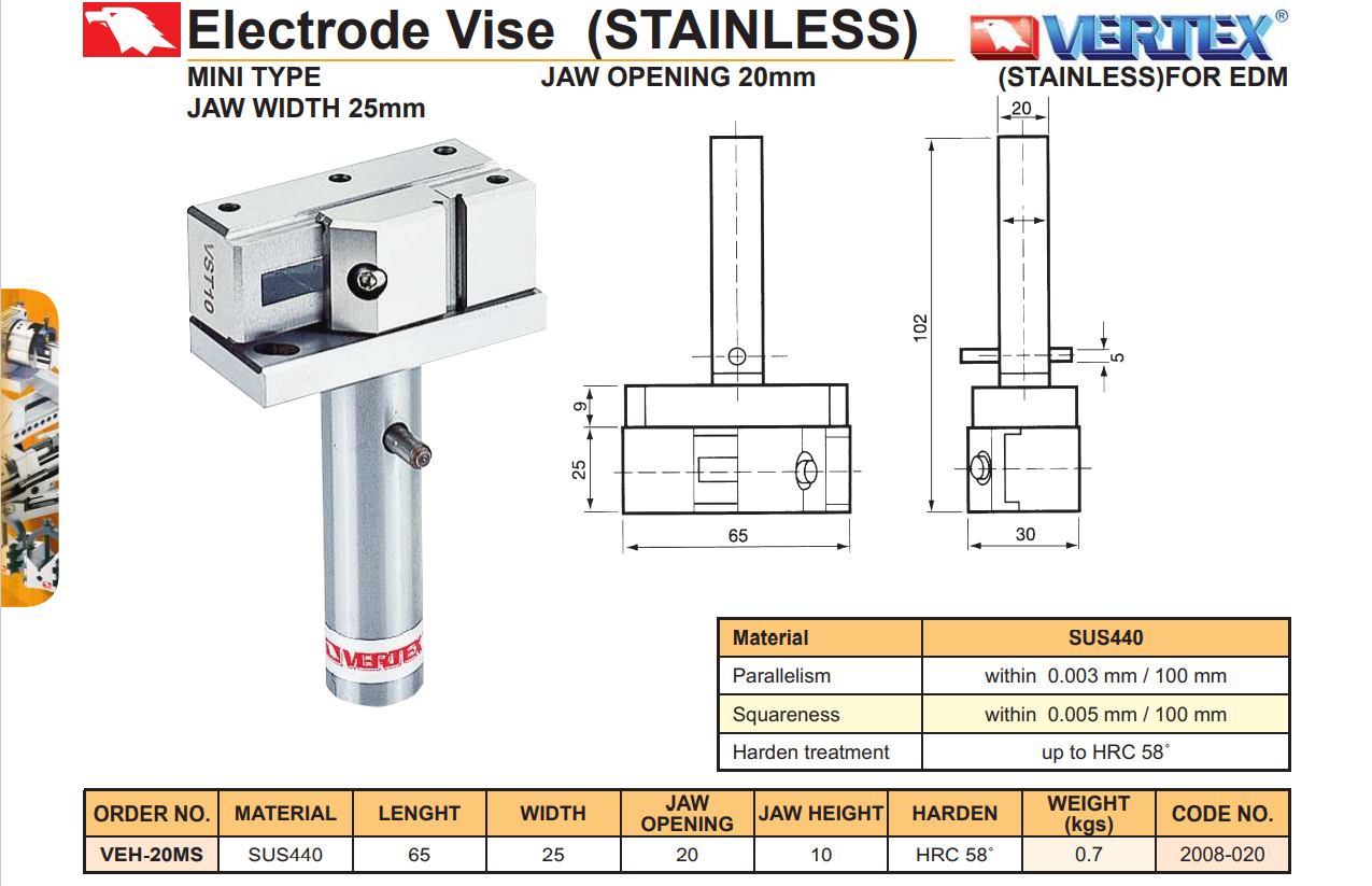 Ê tô kẹp điện cực Vertex VEH-20MS với vật liệu là thép không gỉ, dùng để gá kẹp các điện cực đồng trong quá trình xung.
