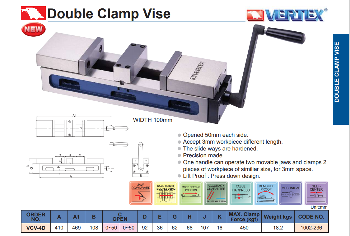 – Độ mở tối đa cho mỗi hai bên kẹp được là 50 mm.