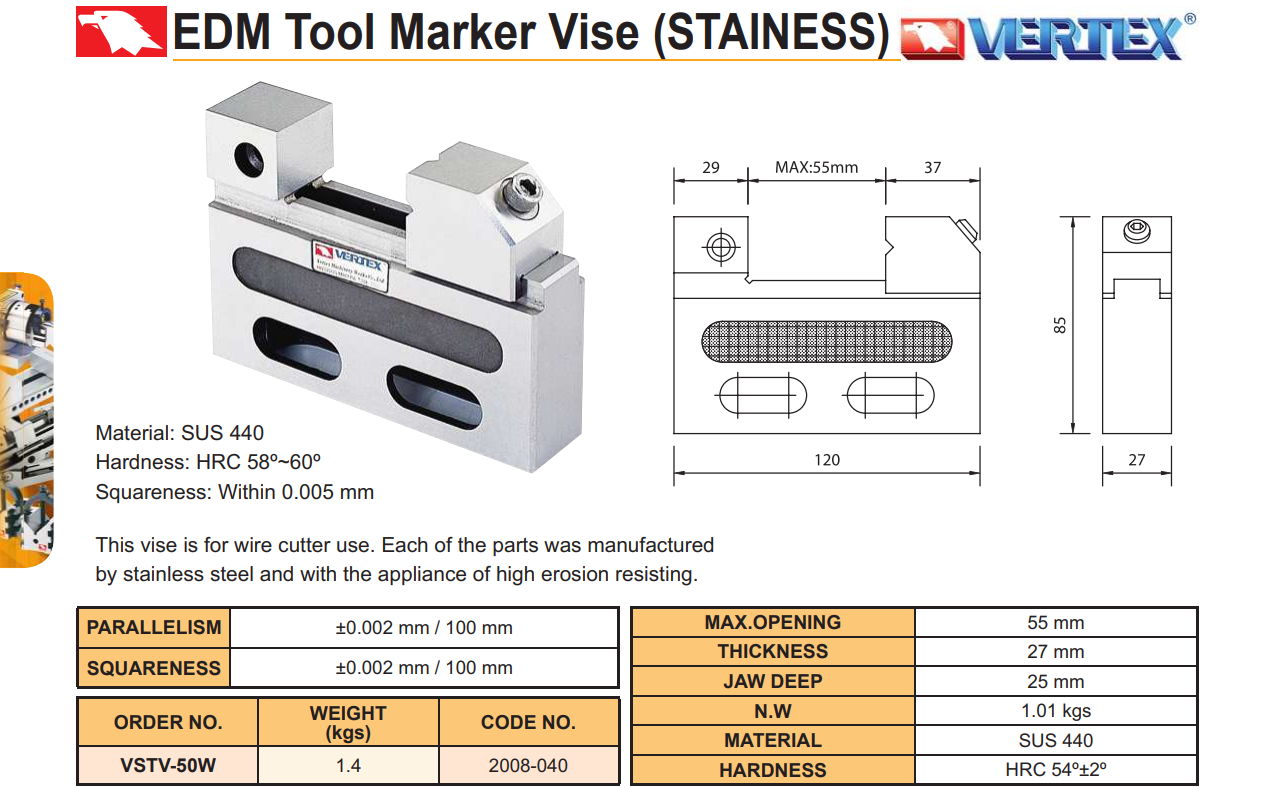 Ê tô máy EDM Vertex VSTV-50W với vật liệu là thép không gỉ, dùng để gá kẹp các chi tiết trong quá trình xung, cắt dây….