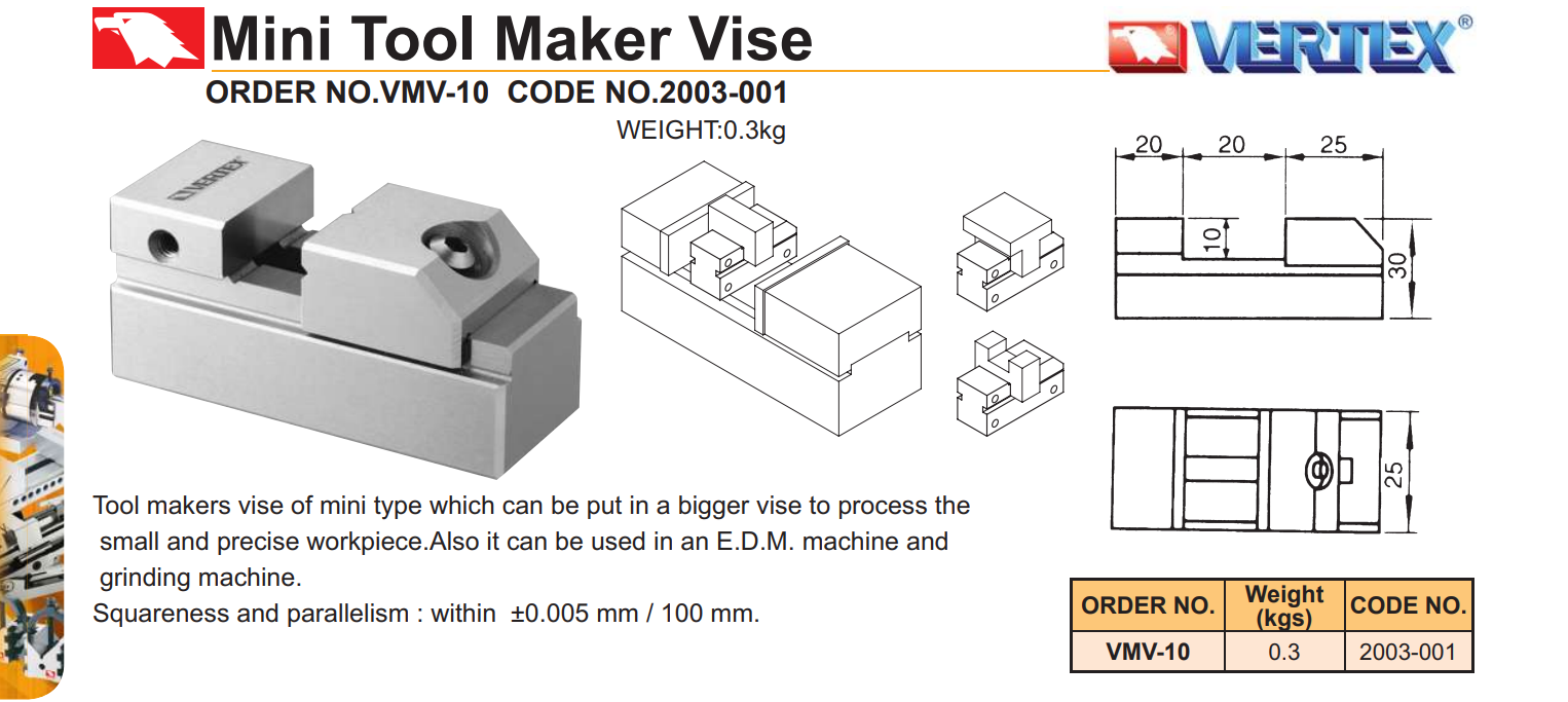 Ê Tô Máy Mài Mini VMV-10. Nhập khẩu từ Vertex, sản phẩm được đánh giá cao về chất lượng, kết cấu nhỏ gọn dễ kẹp chặt, thao tác dễ dàng. Được sử dụng trong gia công cần độ chính xác cao, không gian gia công hẹp và chi tiết nhỏ.