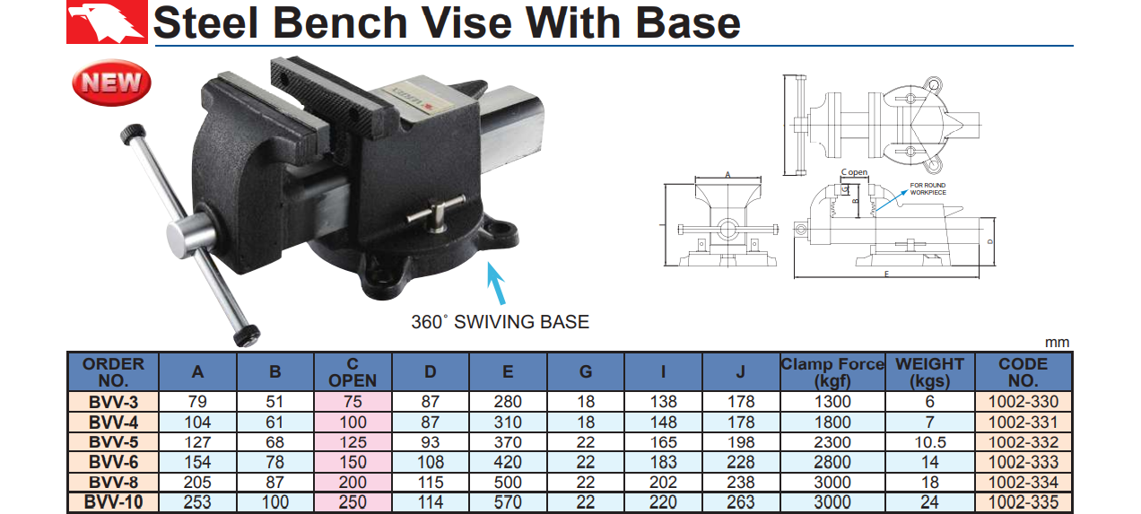 – Ê tô bàn nguội có thể quay tròn 360° trên đế của nó và được cố định vị trí trên đế bằng 1 bu-lông hãm.