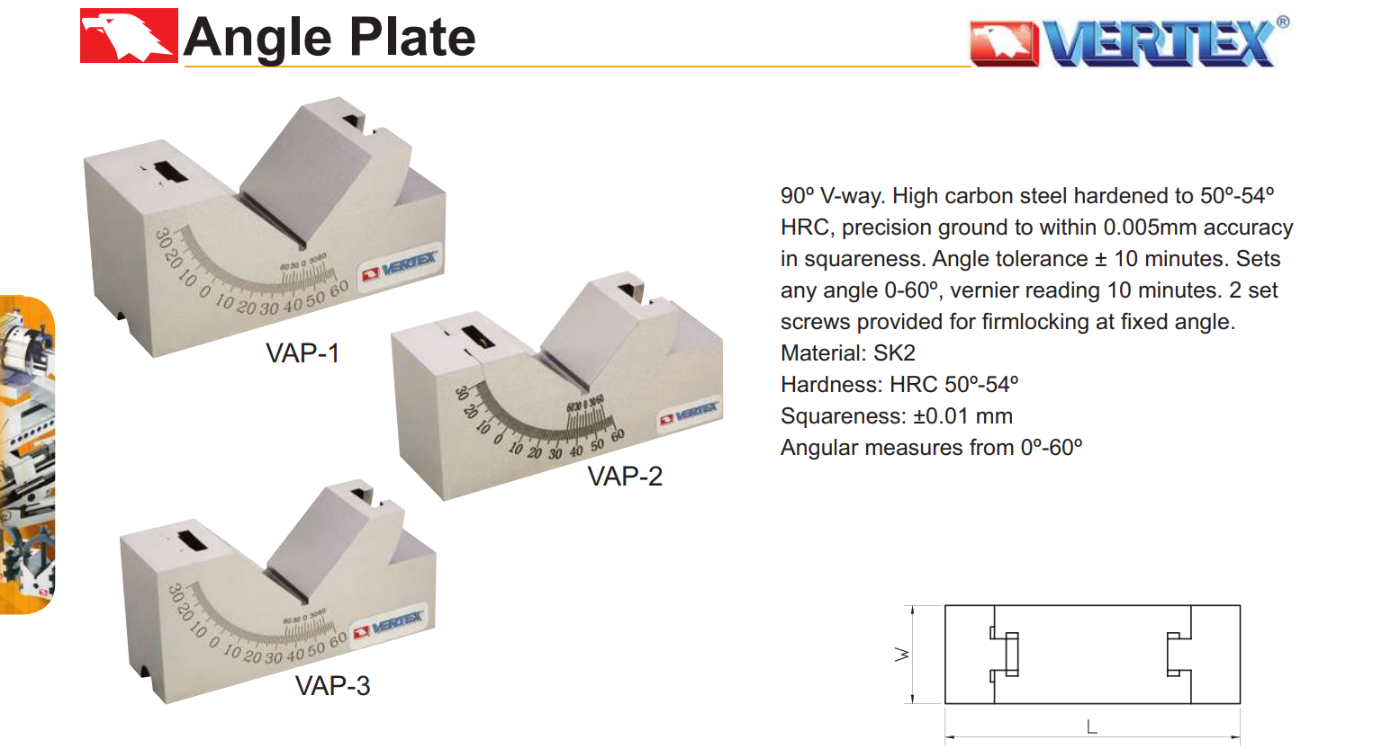 – Khối V điều chỉnh góc nghiêng VAP-1, VAP-2, VAP-3, VAPM-1, VAPM-2, VAPM-3 của VERTEX được sử dụng để định vị tạo góc nghiêng cho chi tiết khi phay, khoan, mài,… Quý khách có thể tham khảo 1 số cách định vị gá kẹp góc nghiêng như hình trên.