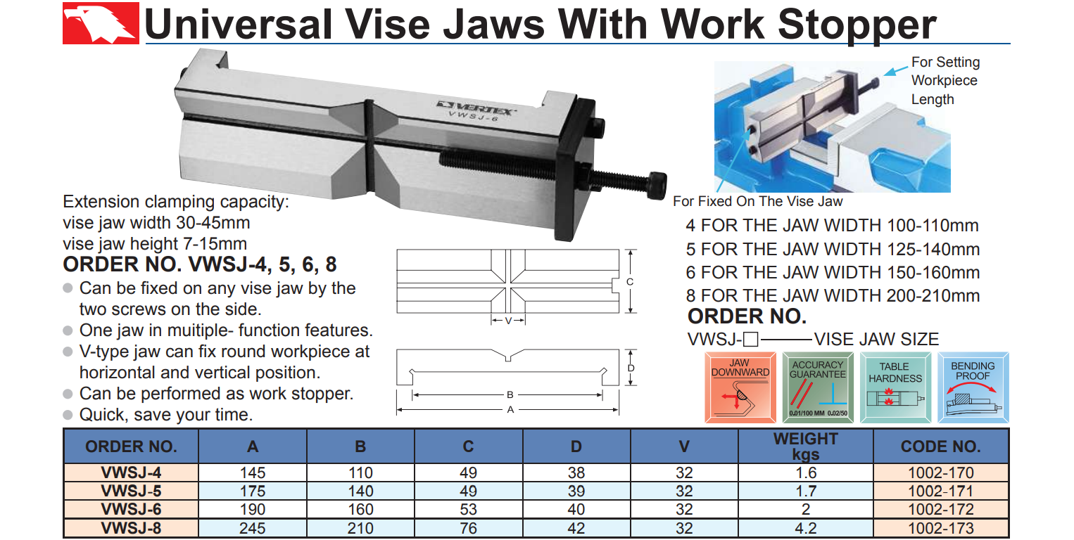 • Má kẹp ê tô mã VWSJ-4, VWSJ-5, VWSJ-6, VWSJ-8 hãng Vertex sản xuất với chất lượng cao, má kẹp được thiết kế nhằm mục đích hỗ trợ cho việc gia công các chi tiết có kích cỡ lớn.
