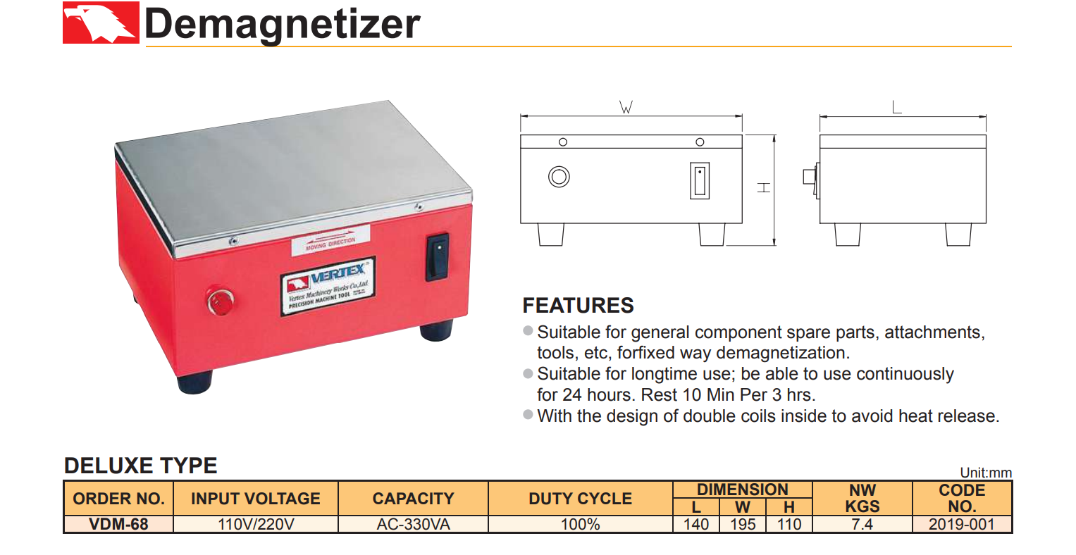 MÁY KHỬ TỪ mã VDM-68 được hãng Vertex sản xuất với chất lượng cao, sản phẩm chuyên dùng cho việc loại bỏ tính chất từ tính cho vật liệu kim loại, được sử dụng rộng rãi trong nhà máy, xưởng gia công cơ khí.