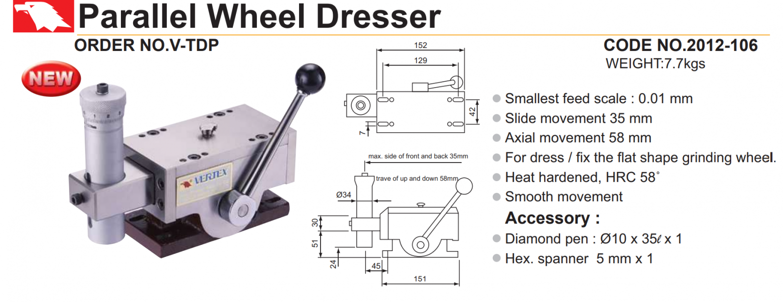 – Đồ gá sửa đá mài song song V-TDP của VERTEX được sử để sửa biên dạng thẳng (flat) của đá mài.
