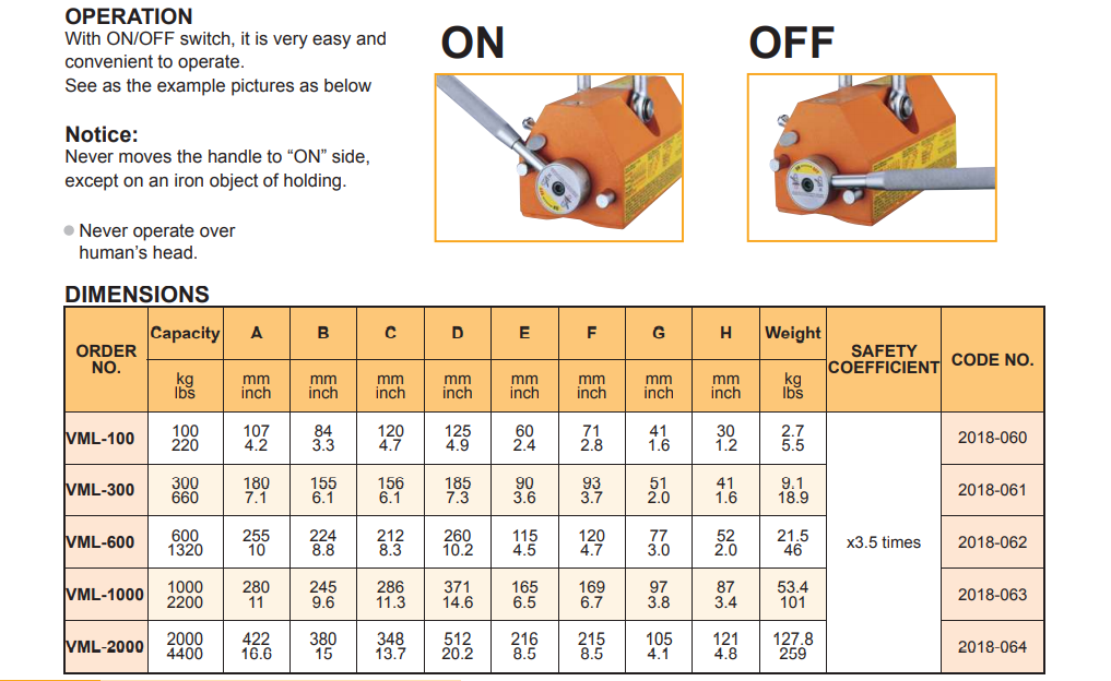 – Móc nâng hạ nam châm từ tính VML-100, VML-300, VML-600, VML-1000, VML-2000, VML-3TH của VERTEX sử dụng làm móc cẩu hút và nâng các chi tiết bằng sắt, thép có khối lượng lớn 100Kg ~ 3000Kg bằng lực từ nam châm vĩnh cửu, mà không cần dây buộc và gây sầy xước chi tiết gia công trong phân xưởng.