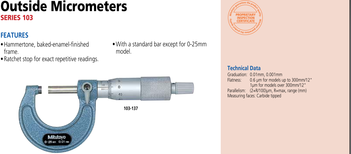 Mã hàng 103-129 là dụng cụ đo panme cơ khí đo ngoài khoảng đo từ 0-25mm/0.001mm