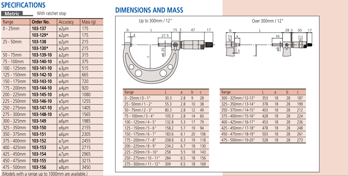 Mã hàng 103-150 là dụng cụ đo panme cơ khí đo ngoài khoảng đo từ 325-350mm/0.01mm