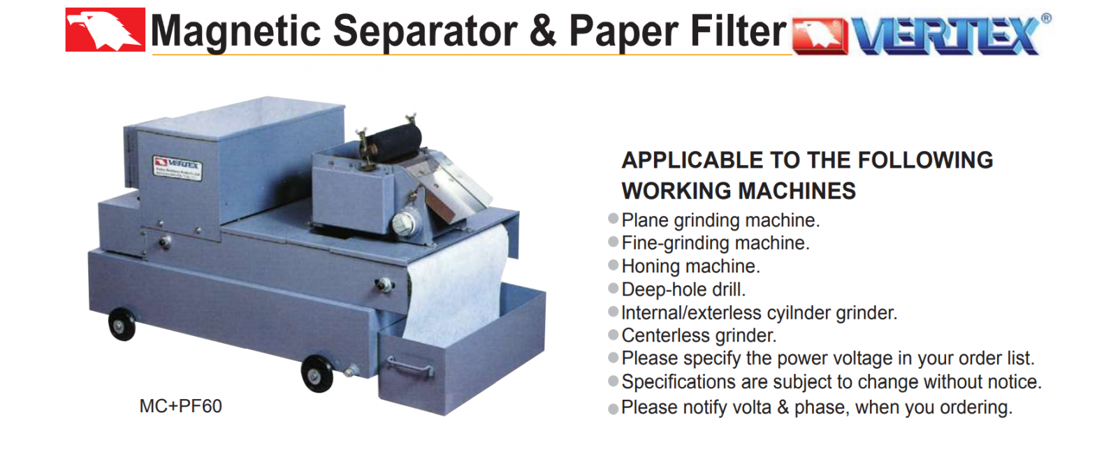 – Thiết bị lọc dầu tưới nguội bằng từ tính và giấy lọc MC+PF-20, MC+PF-40, MC+PF-60, MC+PF-80, MC+PF-120, MC+PF-160 của VERTEX dùng lọc phoi vụn ra khỏi dung dịch tưới nguội bằng từ tính và giấy lọc kết hợp.