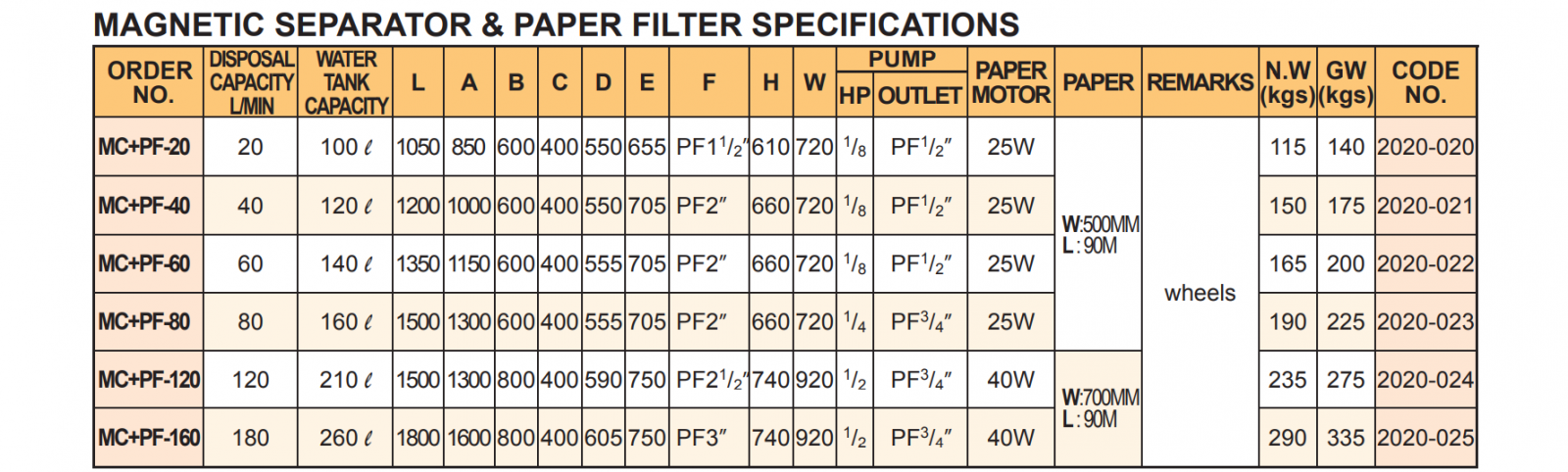 – Thiết bị lọc dầu tưới nguội bằng từ tính và giấy lọc MC+PF-20, MC+PF-40, MC+PF-60, MC+PF-80, MC+PF-120, MC+PF-160 kết hợp lọc được phoi kim loại lớn bằng lực từ, giấy lọc sẽ lọc các phoi kim loại nhỏ (50mm; 30mm; 15mm) và các phoi phi kim loại.