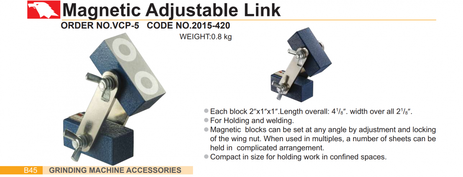 – Thiết bị nối từ tính VCP-5 bao gồm 2 khối đế từ kích thước 2”x1”x1”, liên kết với nhau bằng 2 thanh đai 2 bên. Hai khối đế từ được cố định vị trí tương đối với nhau bằng 2 đai ốc có tai.