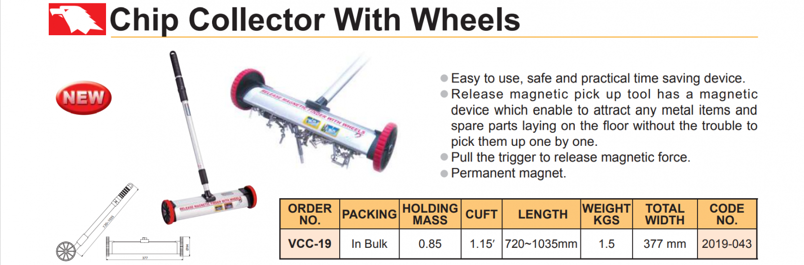 – Thiết bị thu phoi bằng nam châm có bánh xe VCC-19 hút được các vật kim loại và các phoi văng ra trên sàn bên ngoài.