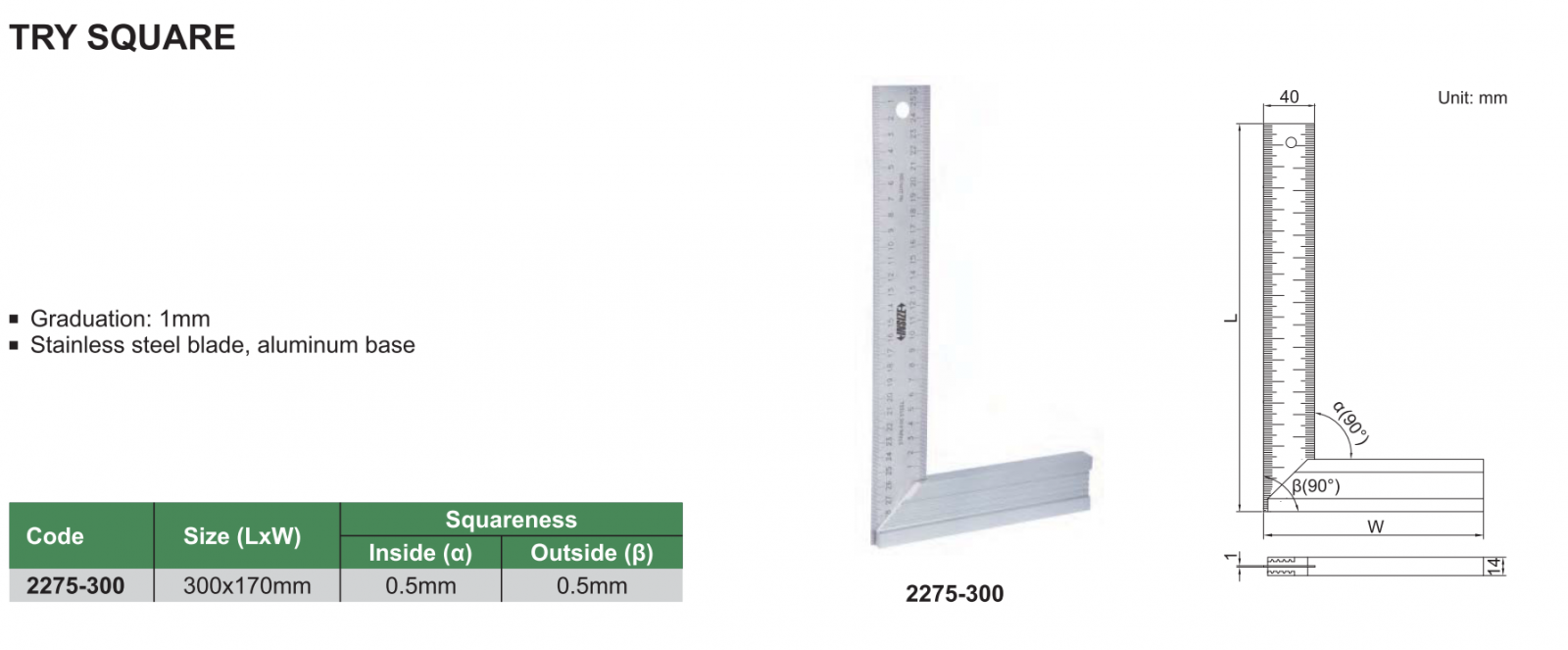 Thước đo góc INSIZE 2275-300 , TRY SQUARE 2275-300